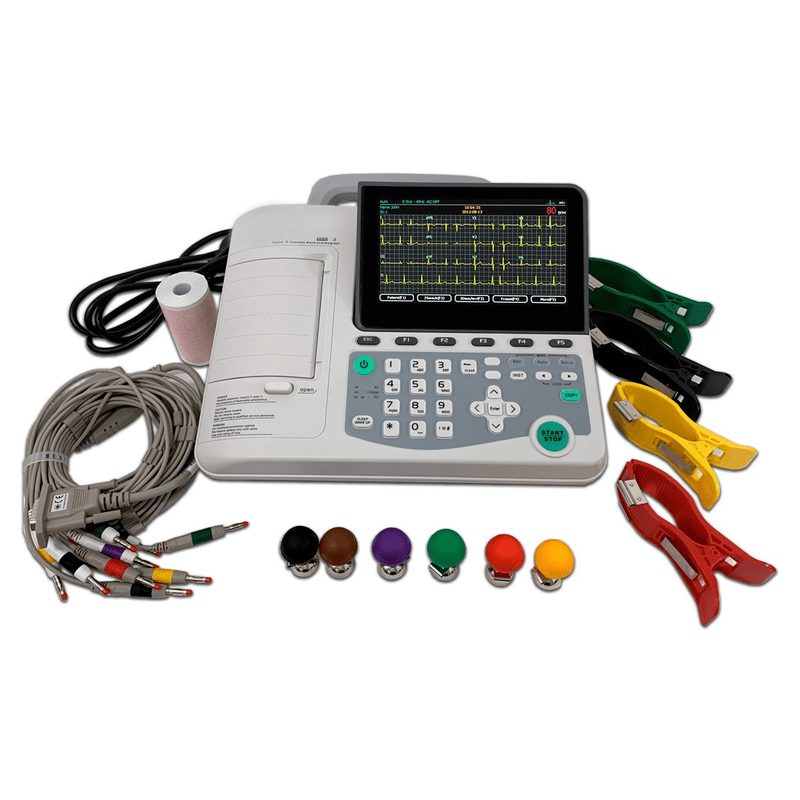 El Electrocardiógrafo de 3 Canales y 12 Derivaciones EC EM301 es una solución práctica para consultorios, clínicas, hospitales y unidades de diagnóstico que requieren registrar la actividad eléctrica del corazón con eficiencia y facilidad de operación. Su diseño compacto incorpora pantalla LCD abatible de 7 pulgadas, sistema de impresión térmica integrada, batería recargable de ion-litio y tres modos de funcionamiento: automático, manual y rítmico.